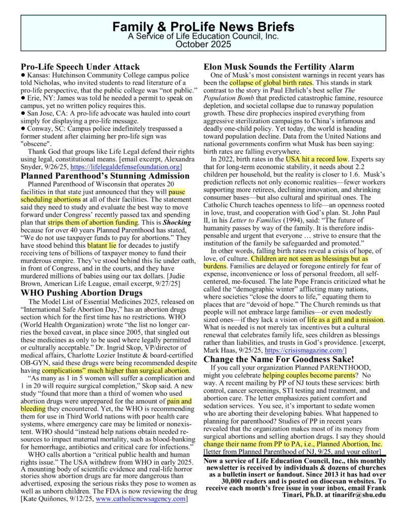 Family & ProLife News Brief: A Service of Life Education Council, Inc. – October 2025 Newsletter October 1, 2025 LECUncategorized No Comments