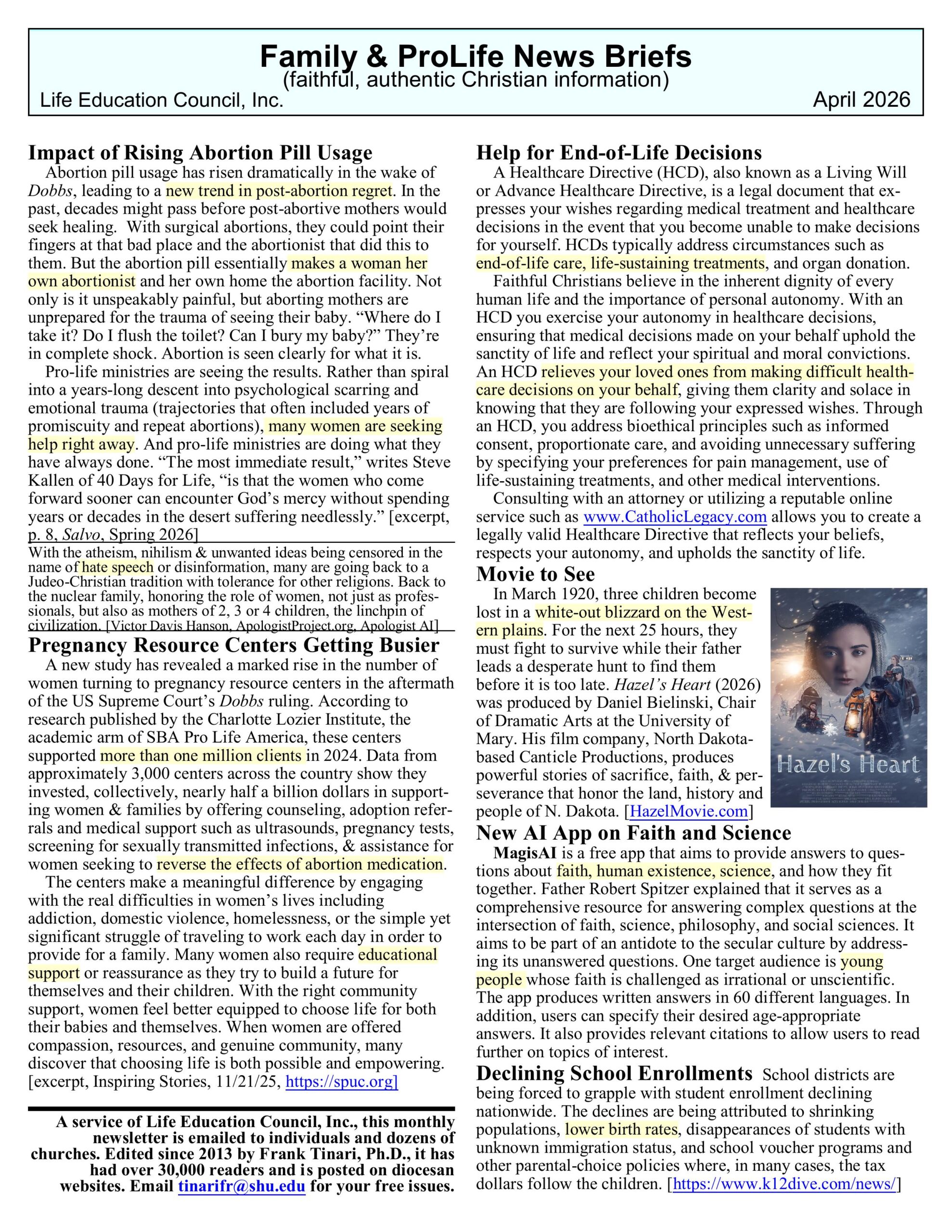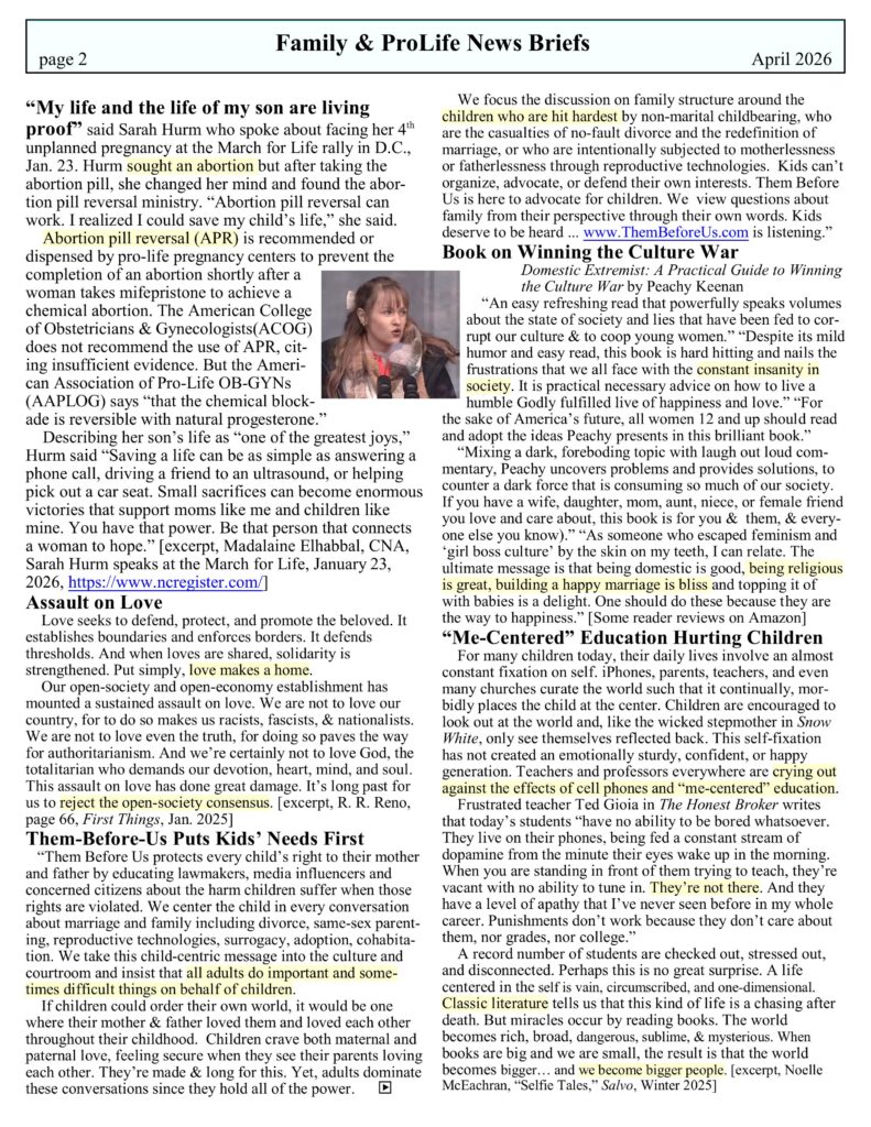 • Family & ProLife News Brief: A Service of Life Education Council, Inc. – April 2026 Newsletter