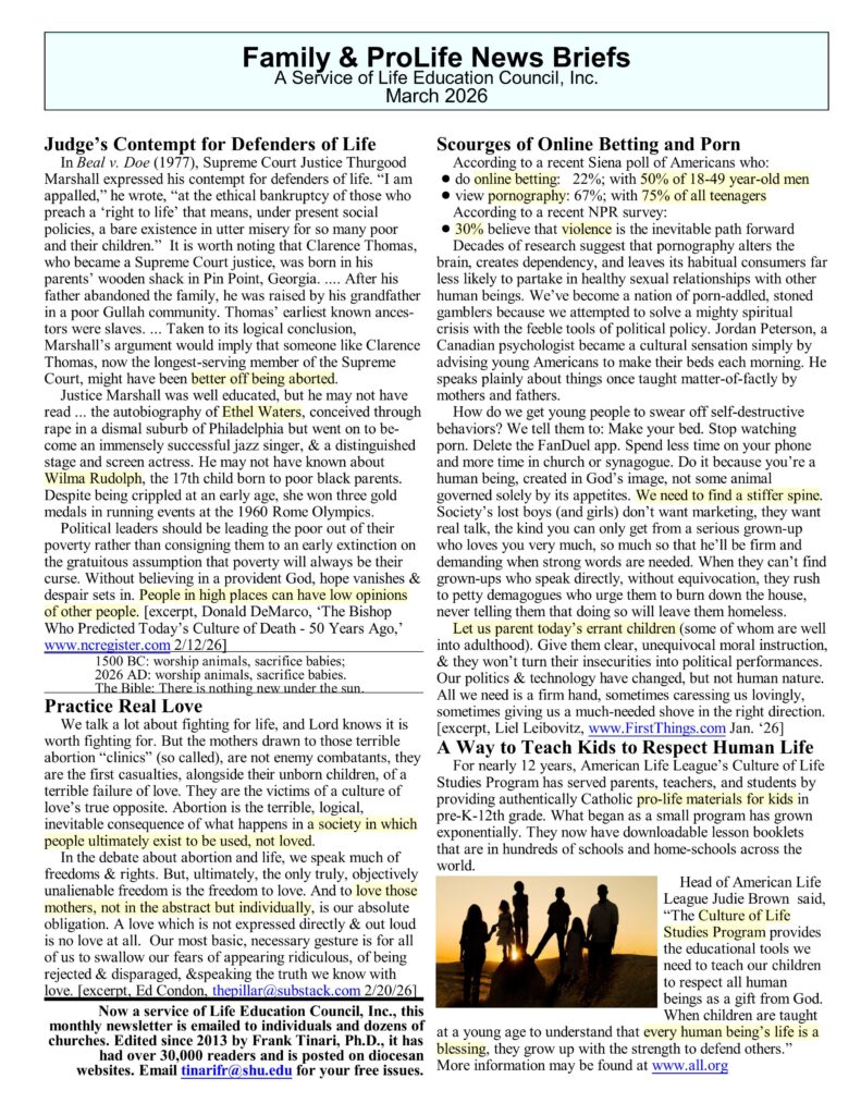 • Family & ProLife News Brief: A Service of Life Education Council, Inc. – March 2026 Newsletter